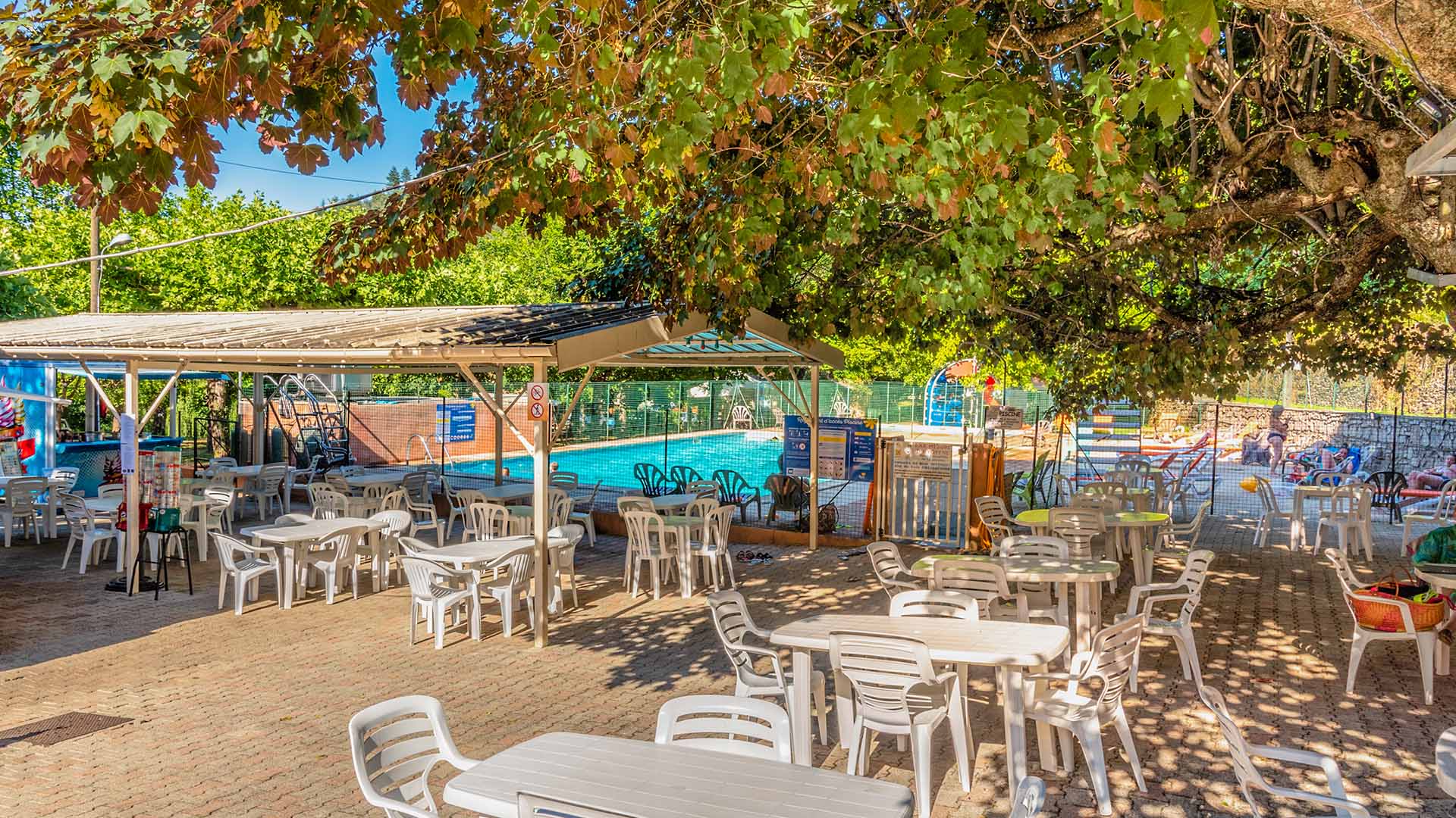In unserer Snackbar mit großer, teils überdachter und teils unter Bäumen liegender Terrasse mit Blick auf den Pool, die im Juni, Juli und August geöffnet ist, können sich Groß und Klein tagsüber an Gegrilltem, Pommes frites, schönen, abwechslungsreichen und leckeren Salaten, aber auch an Crêpes, Eis und kühlen Getränken erfreuen.